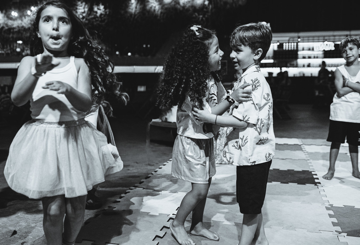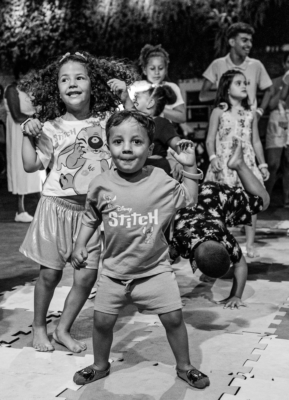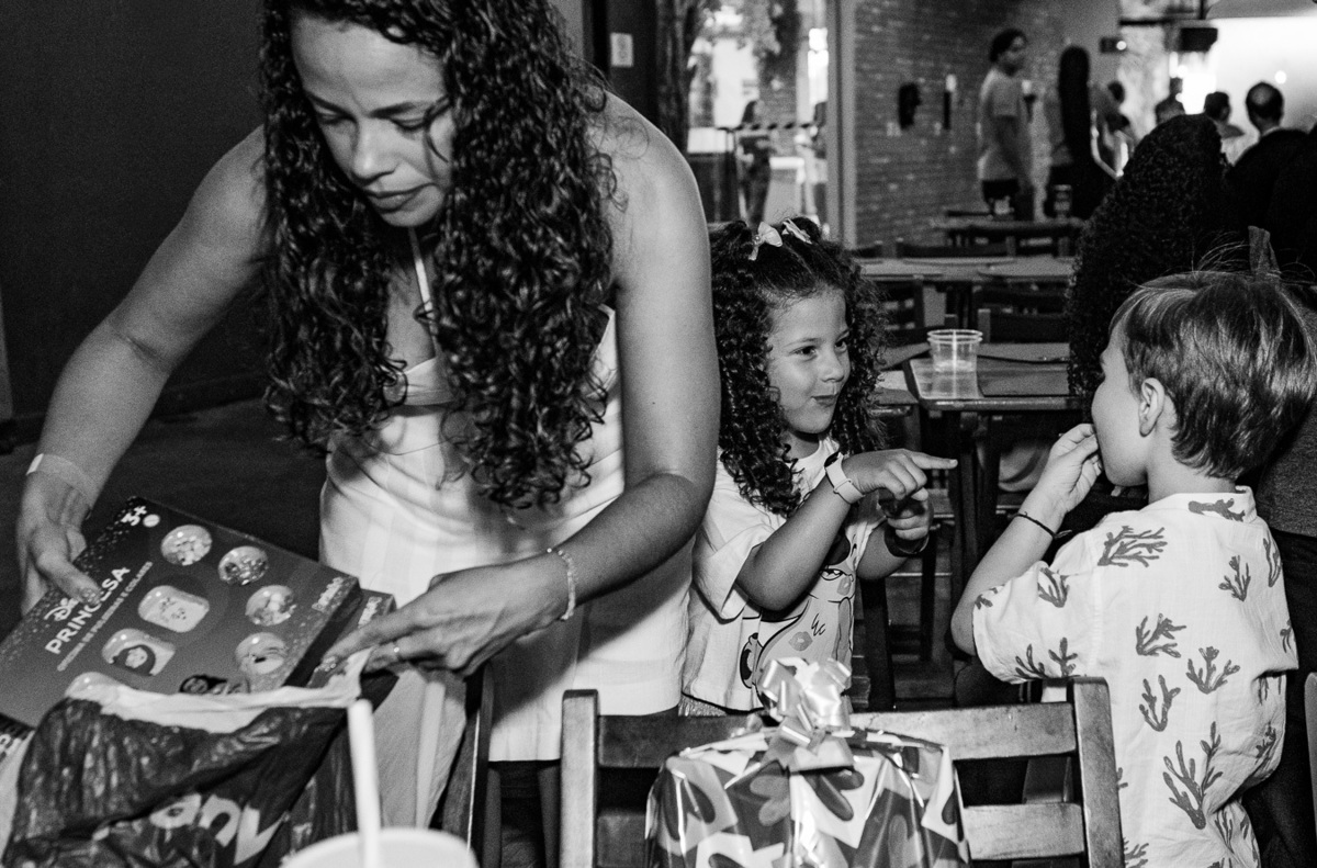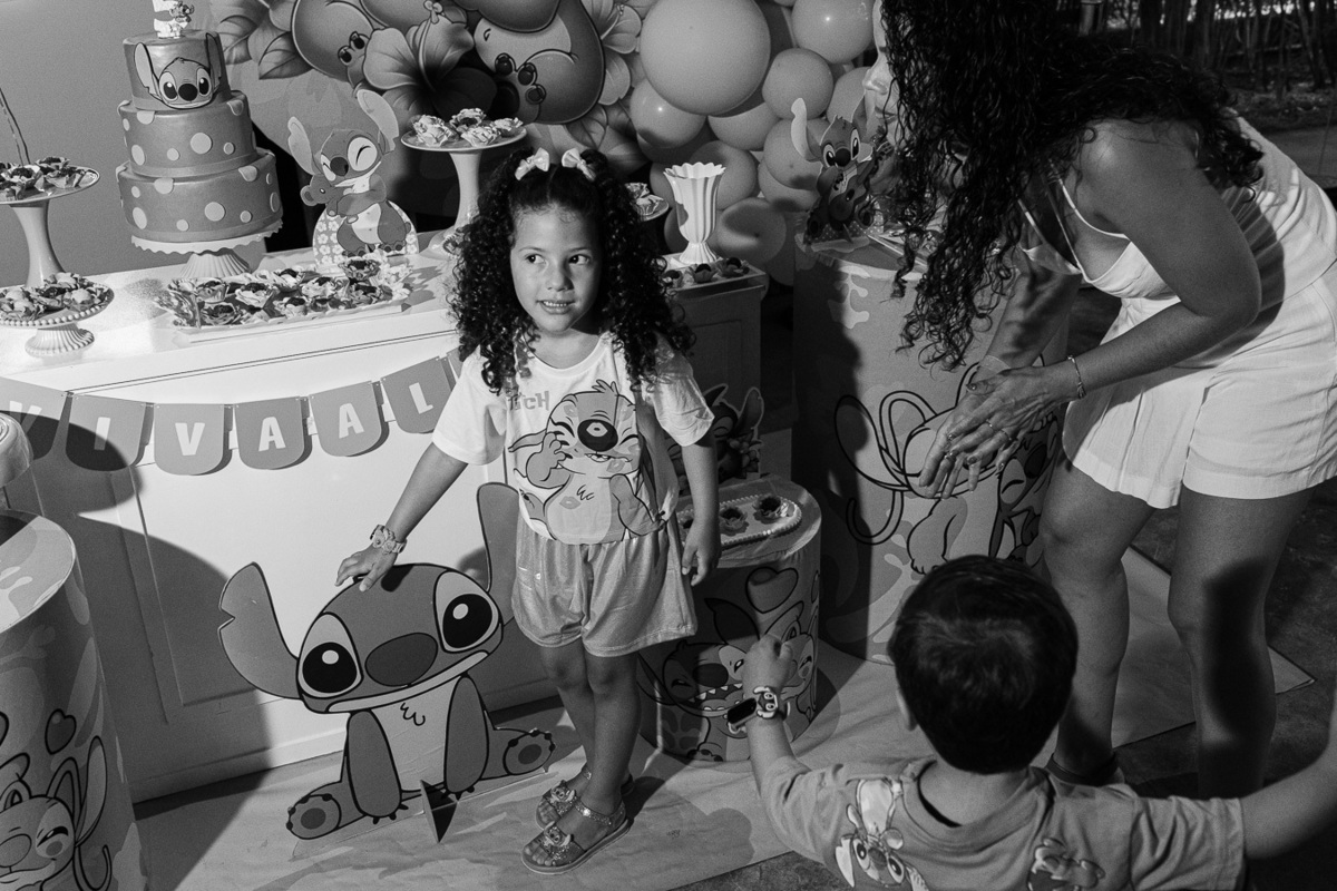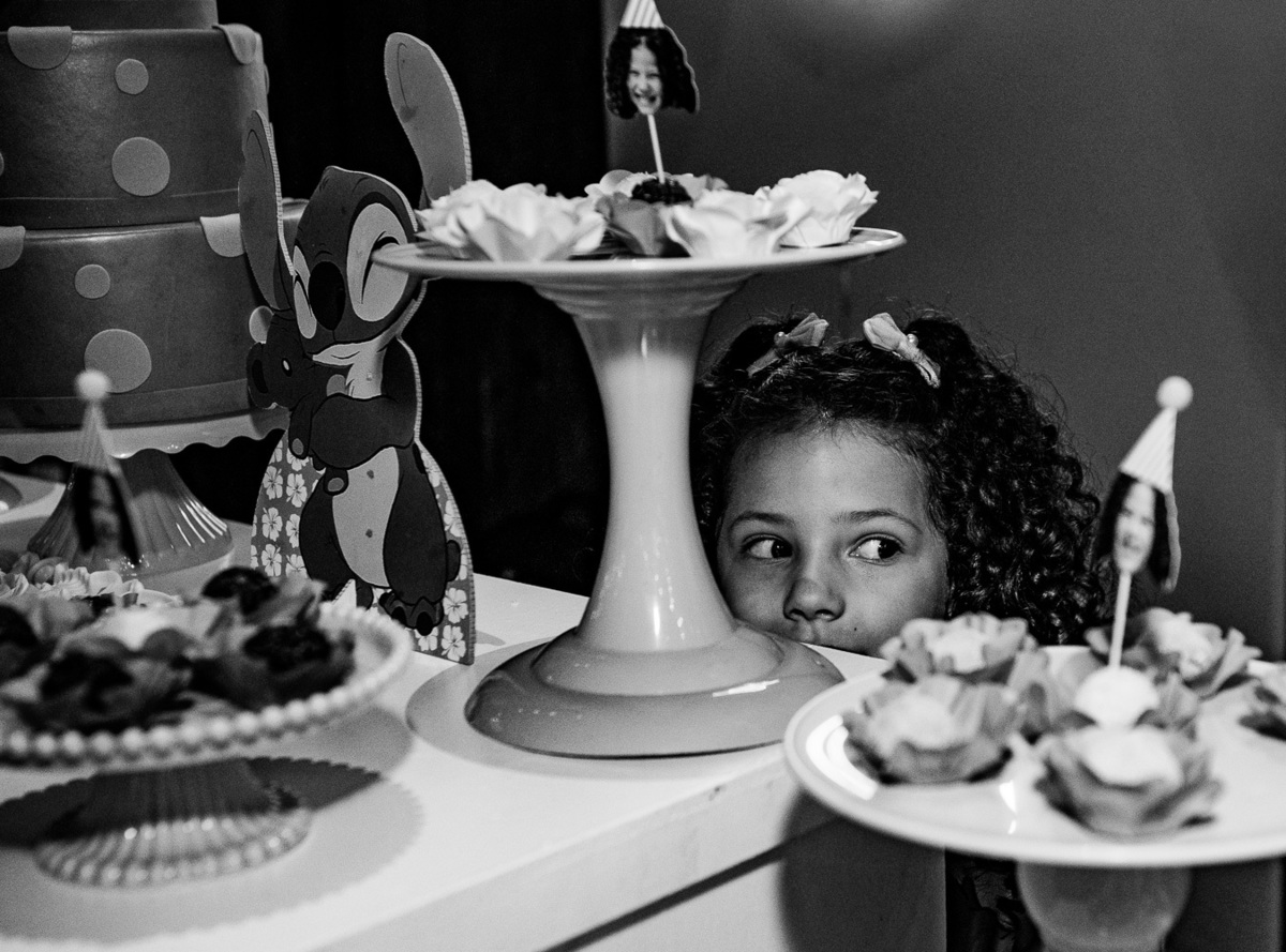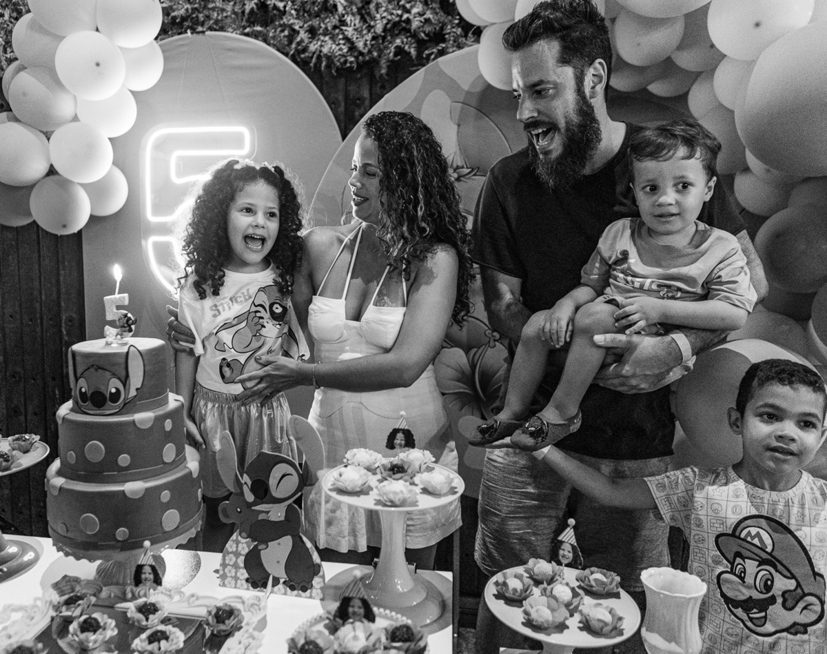 - O preto e branco para focar naquilo que o barulho da festa às vezes esconde: um olhar de lado, a expectativa pelo bolo, o gesto espontâneo.