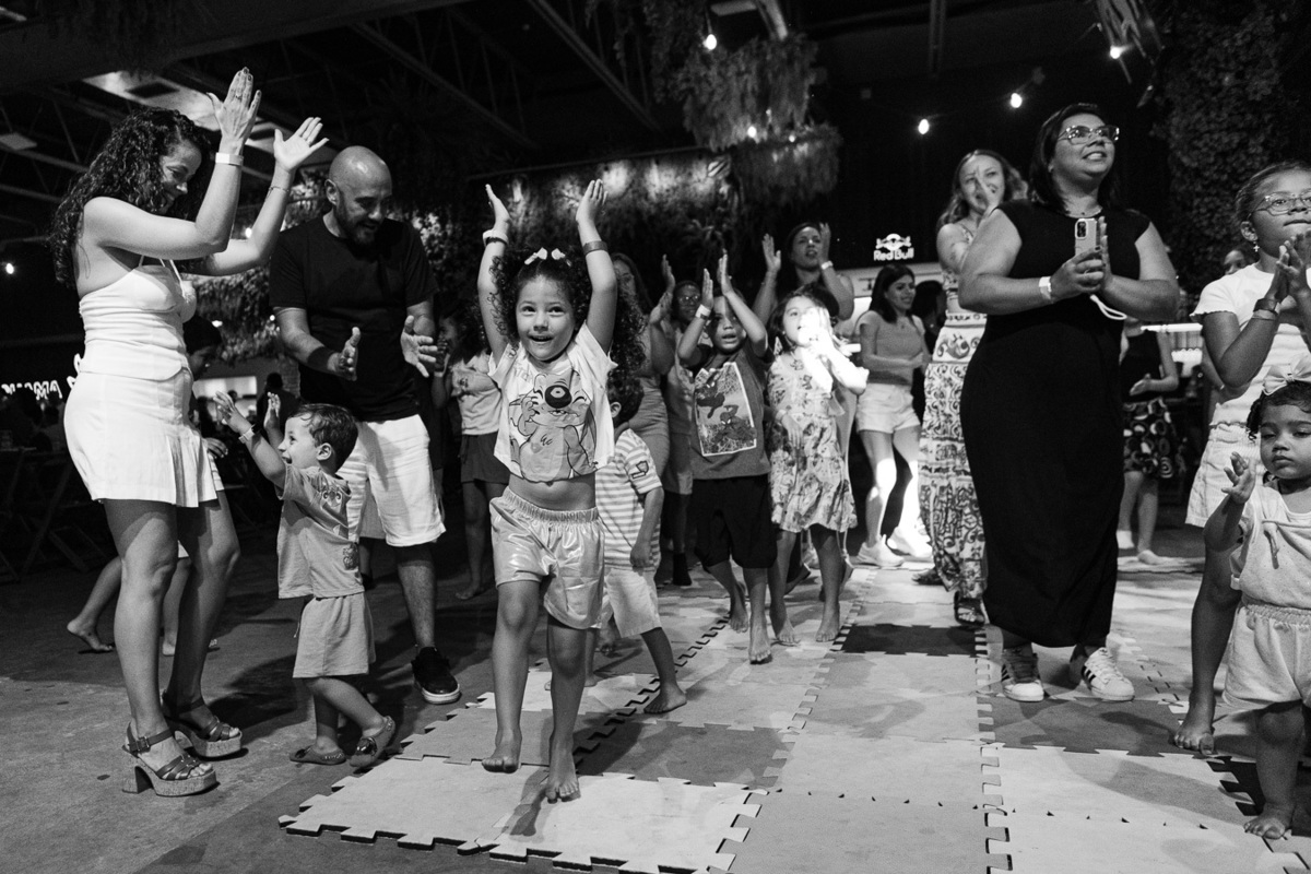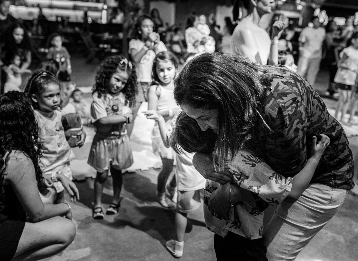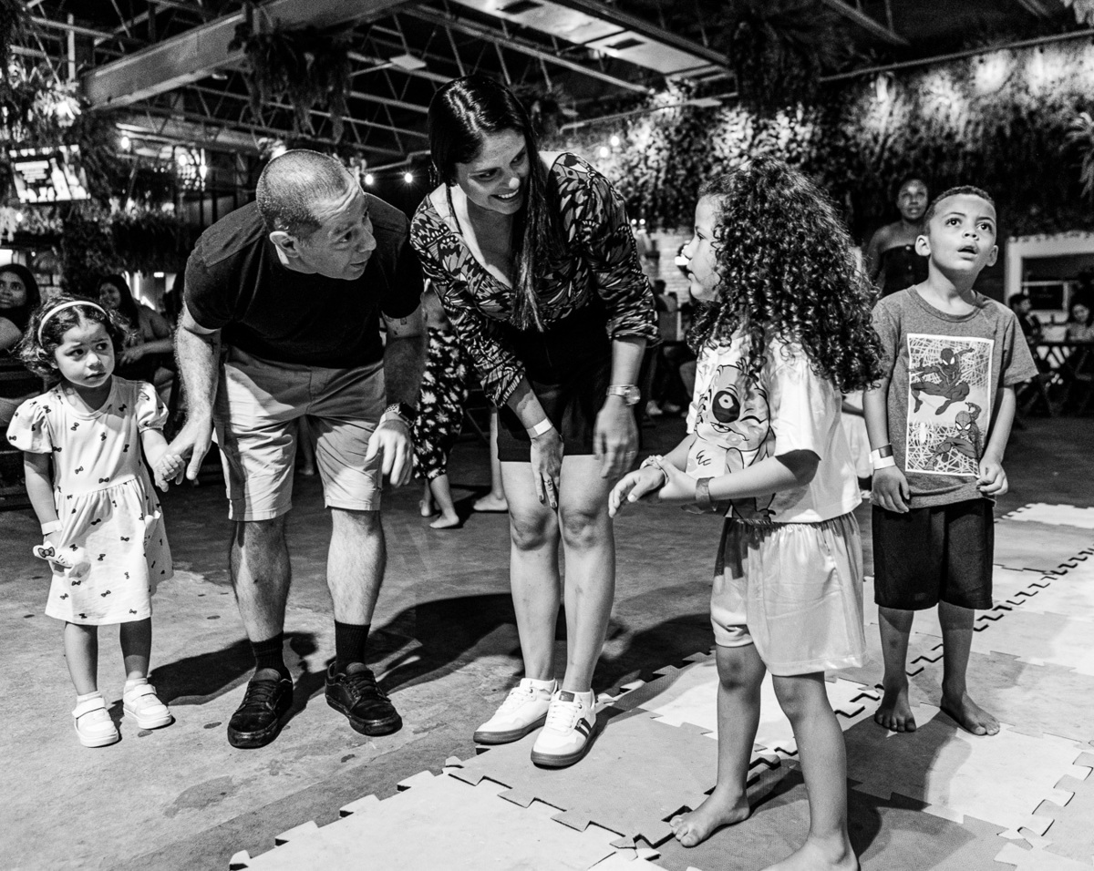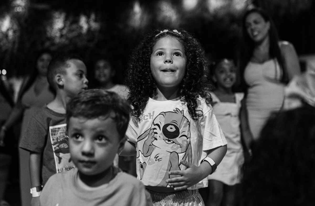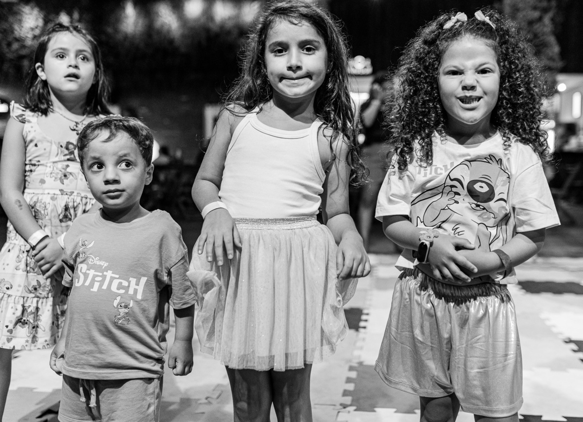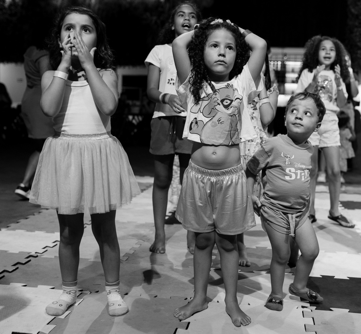 - O preto e branco para focar naquilo que o barulho da festa às vezes esconde: um olhar de lado, a expectativa pelo bolo, o gesto espontâneo.