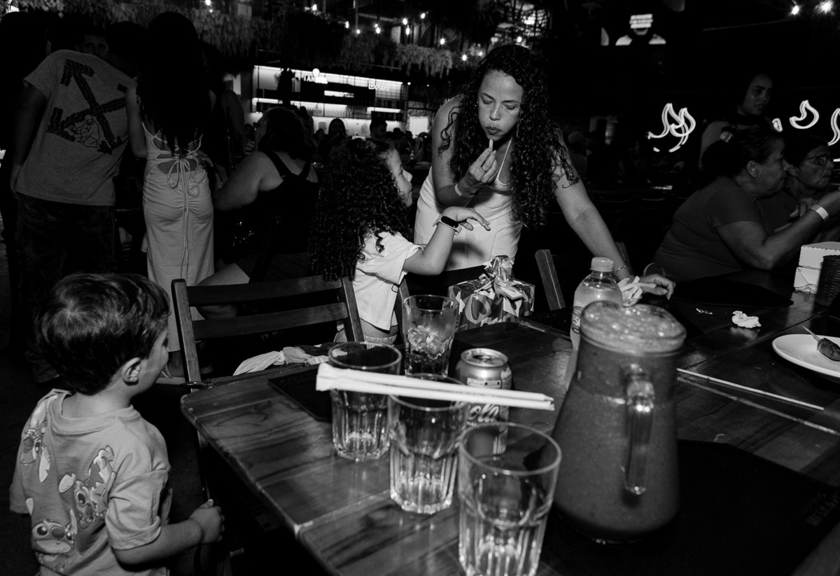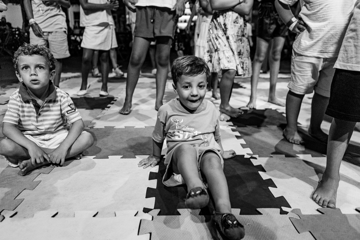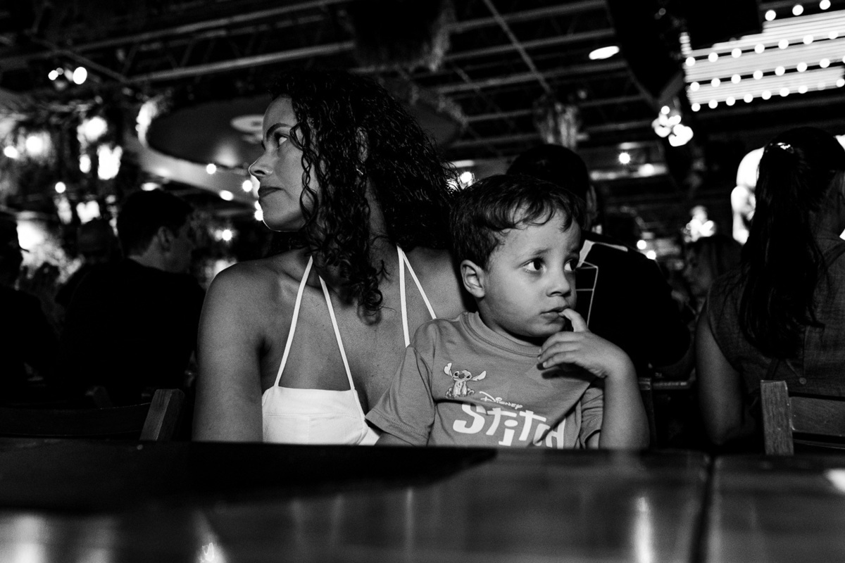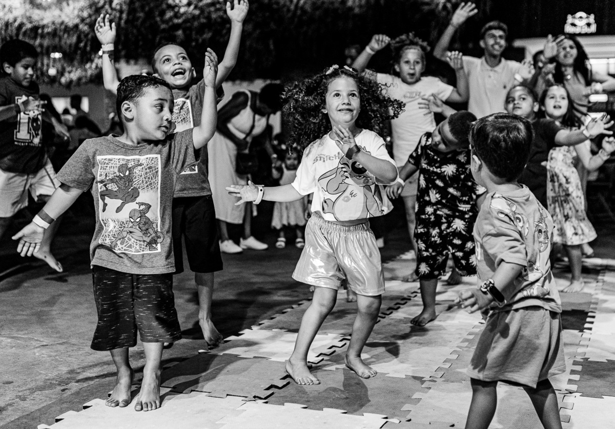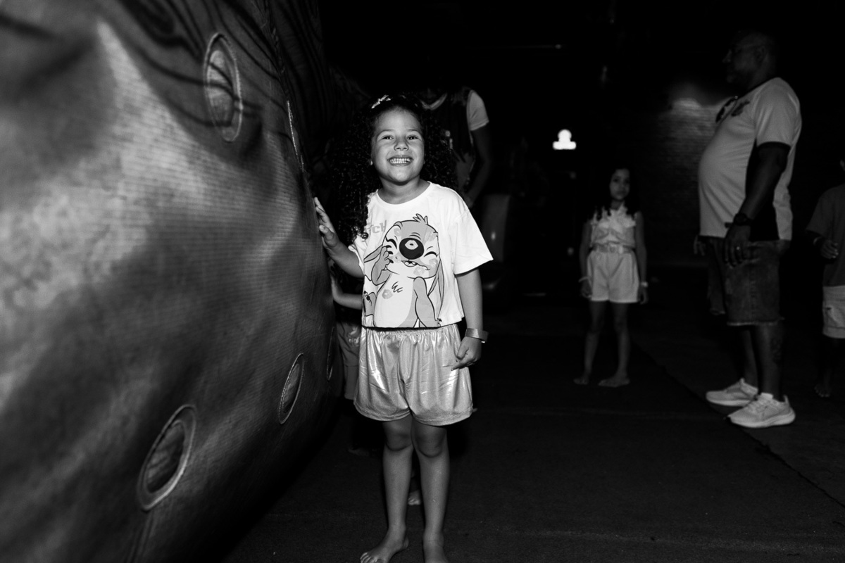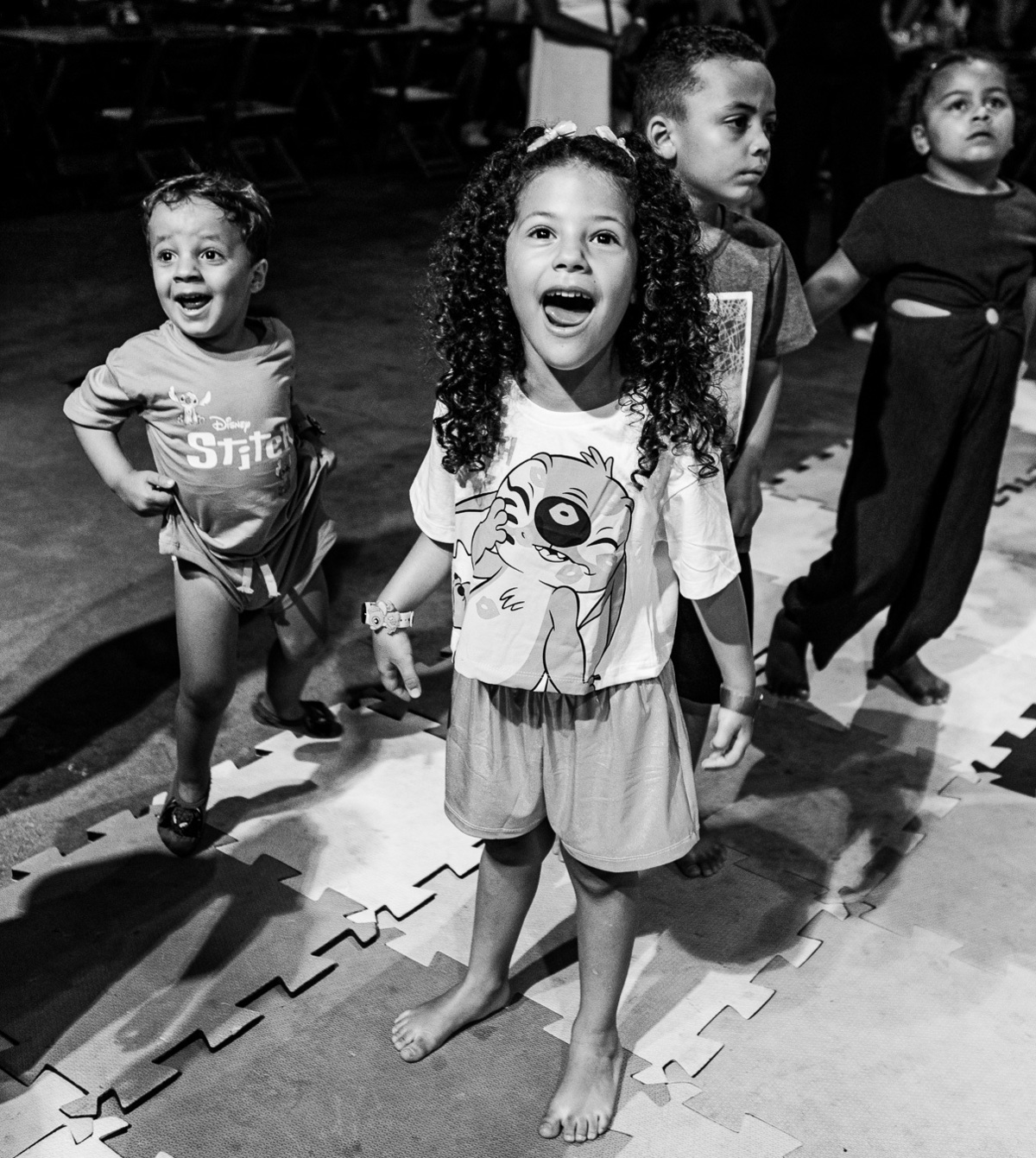 - O preto e branco para focar naquilo que o barulho da festa às vezes esconde: um olhar de lado, a expectativa pelo bolo, o gesto espontâneo.