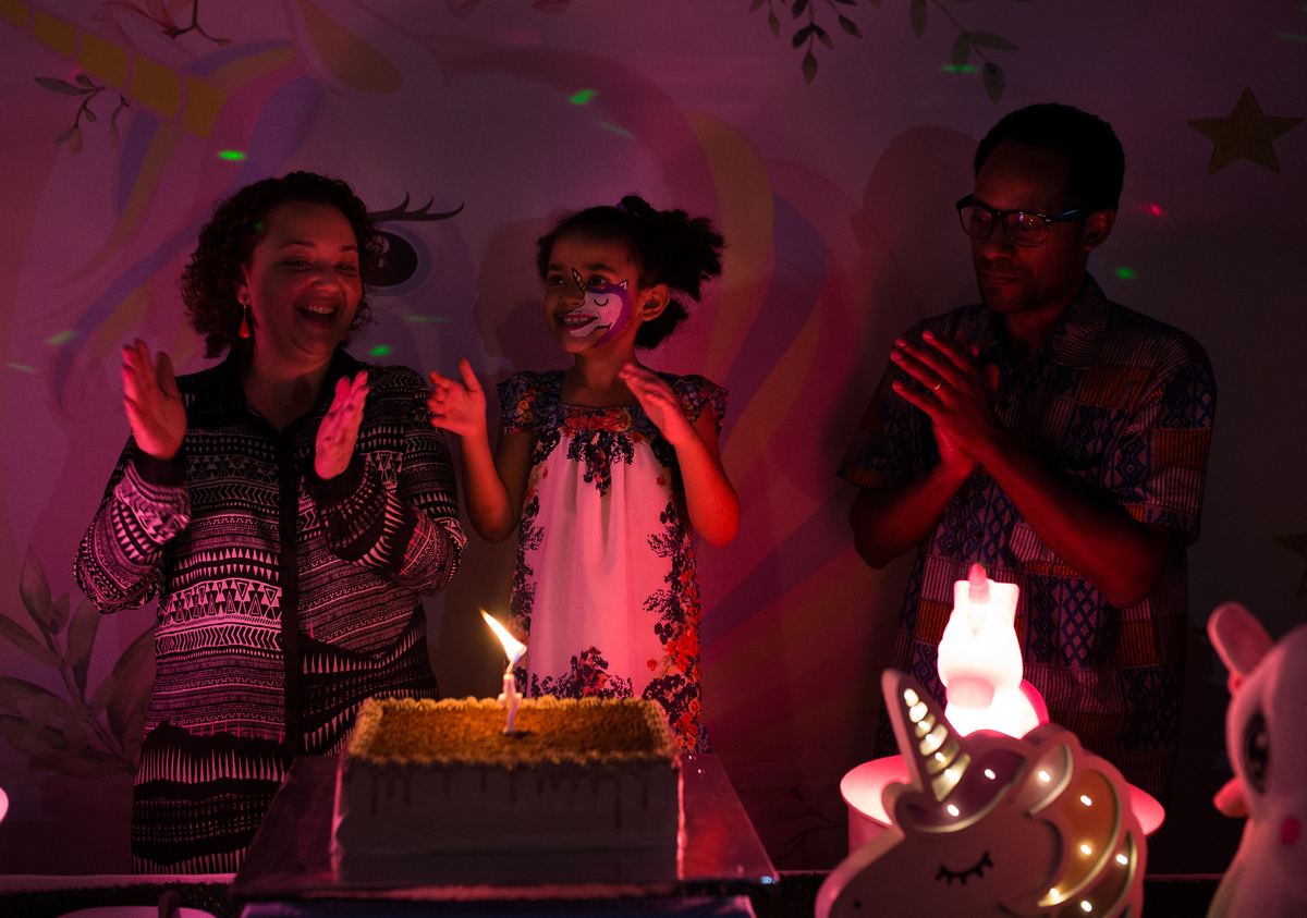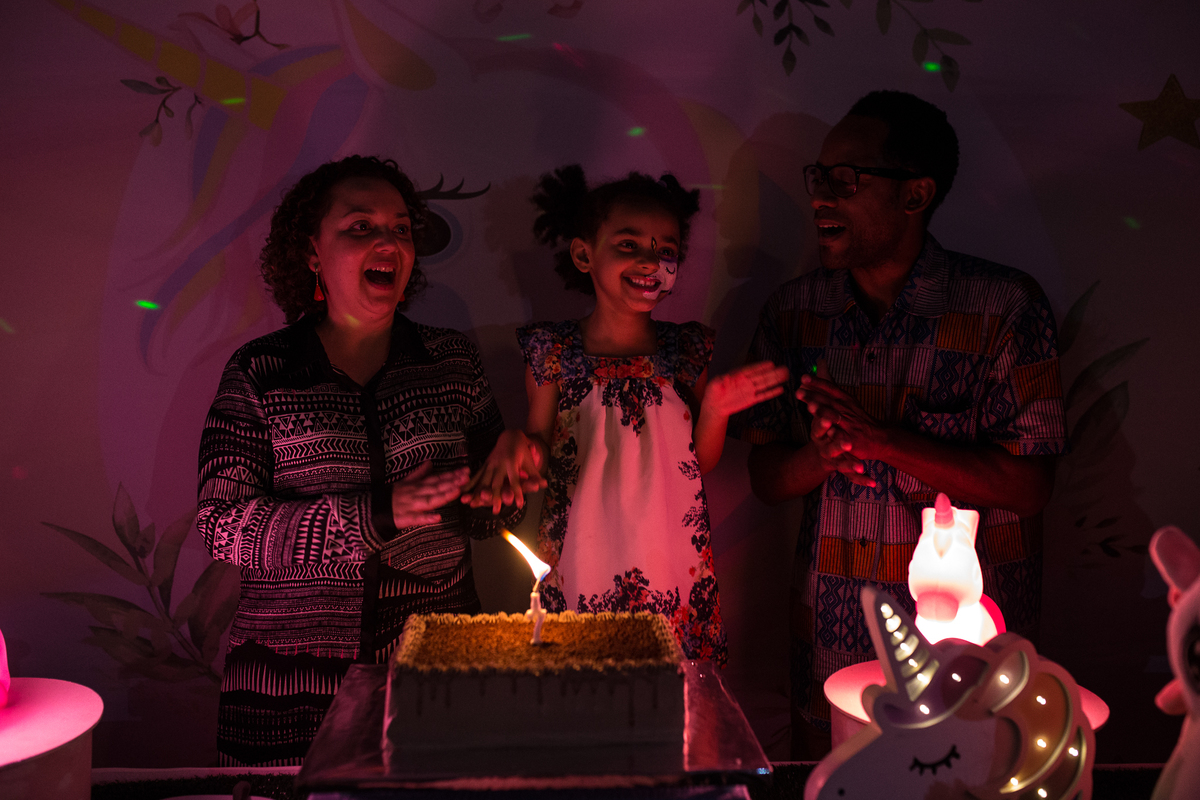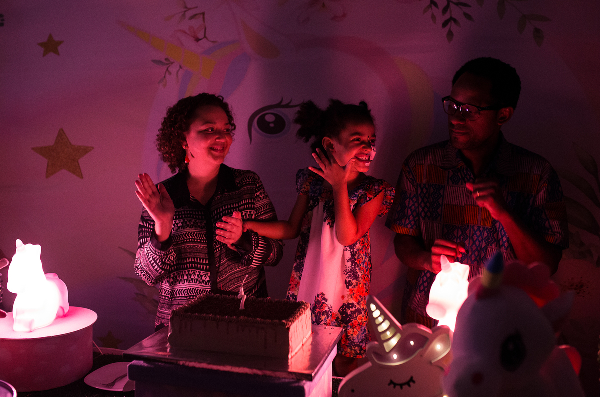 Na hora do parabéns, a iluminação da vela dos sete anos e uma dúzia de unicórnios me deram a luz de cena que eu precisava. Cada momento da infância deve ser fotografado. O tempo passa muito rápido e o que fica e nos fazem relembrar as passagens da vida são as fotografias.