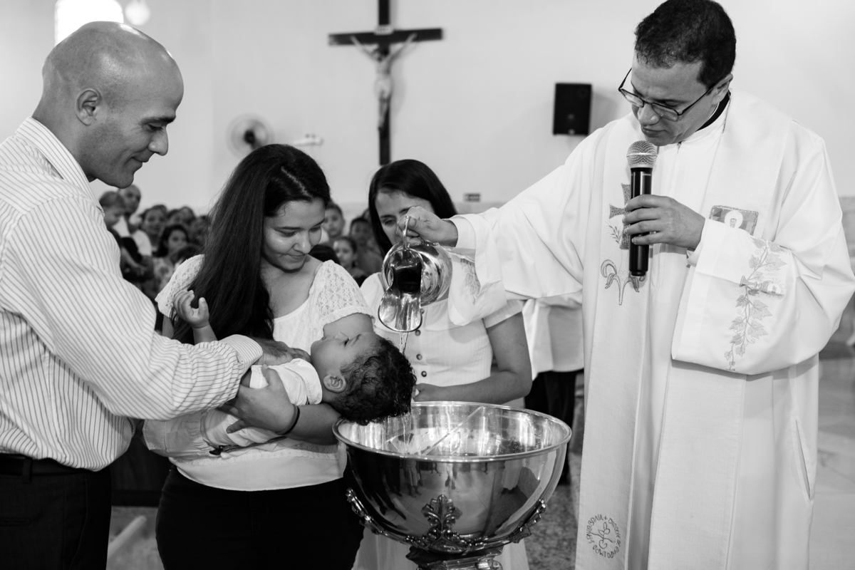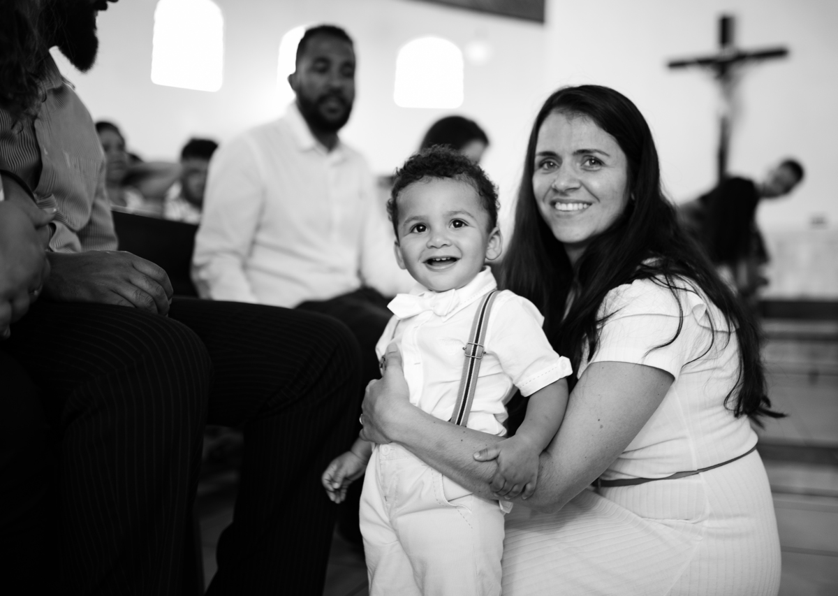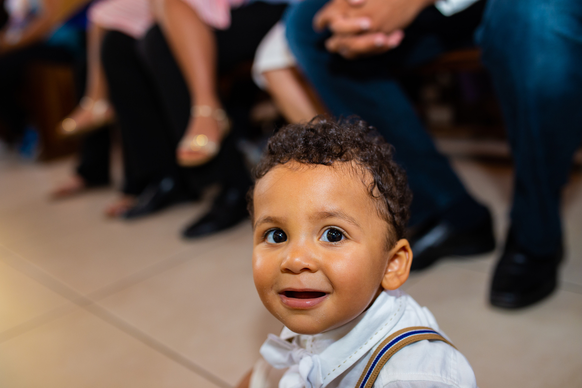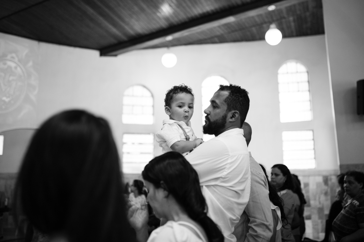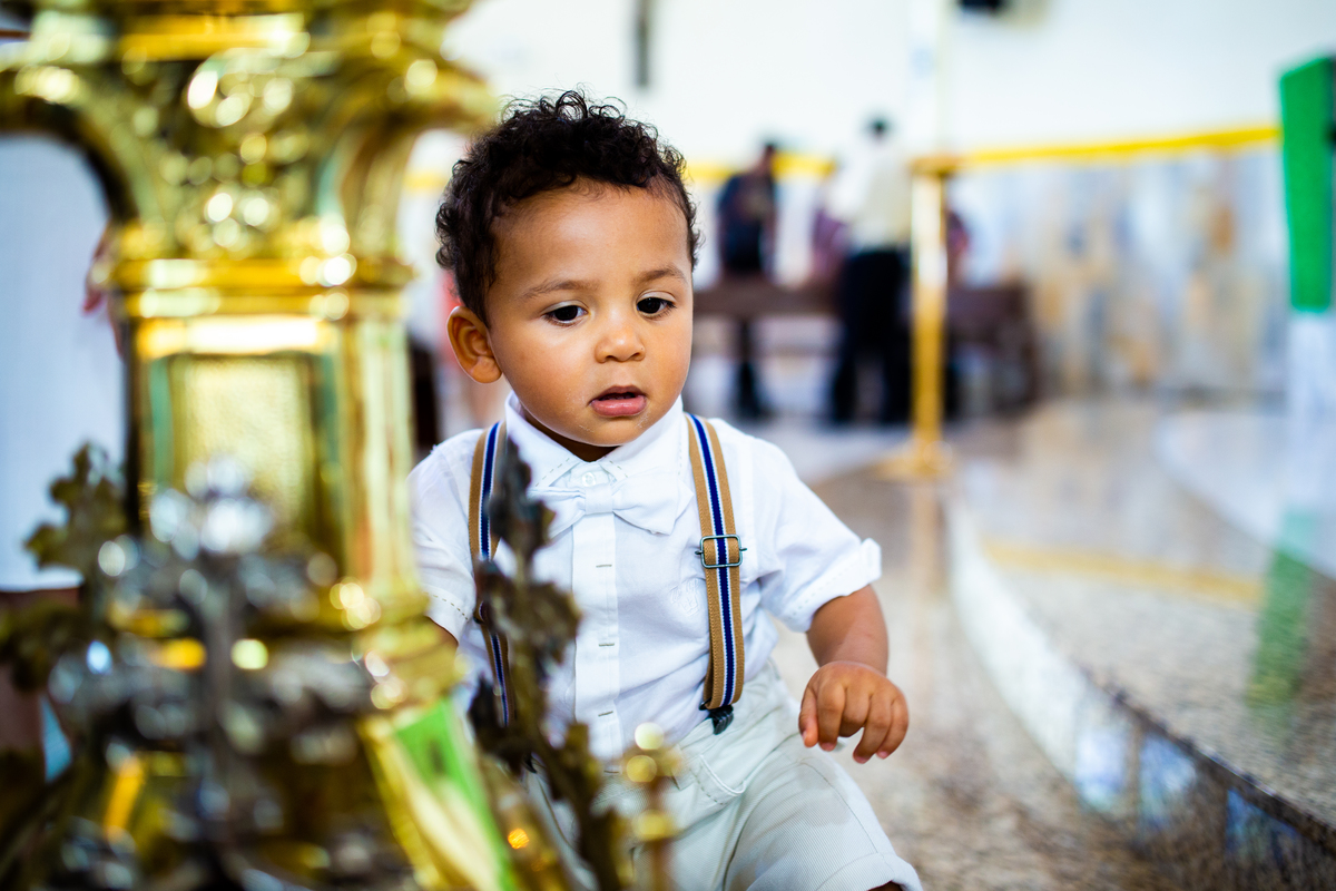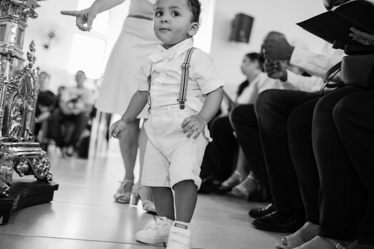 Acompanho muitas famílias e já fotografei muitos momentos especiais. Com a família do Gabriel não foi diferente. Gabriel estava bastante animado e sapeca. Queria andar pela igreja e ver de perto a pia batismal onde receberia um dos sacramentos mais importantes do cristianismo. De tanta energia despendida ele acabou dormindo no meio da cerimônia e acreditem, acordou com a água do batismo molhando sua cabeça!!