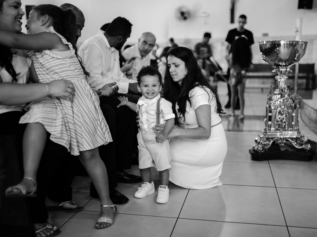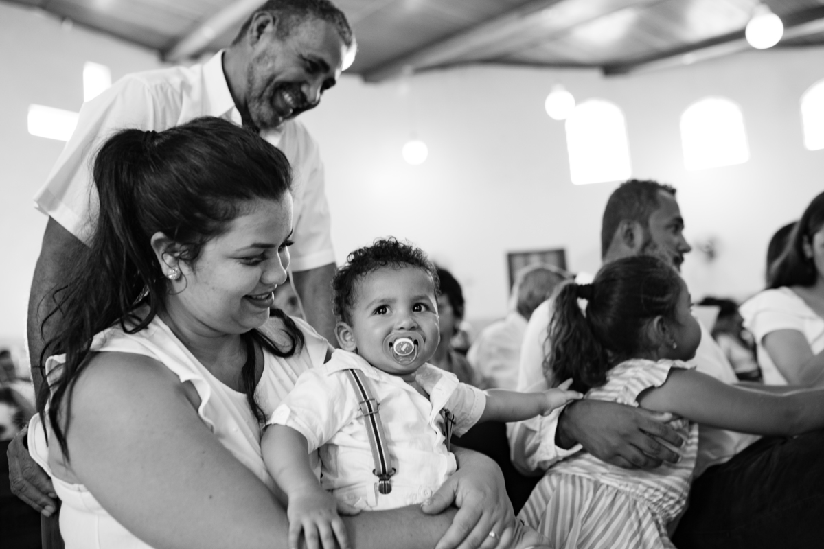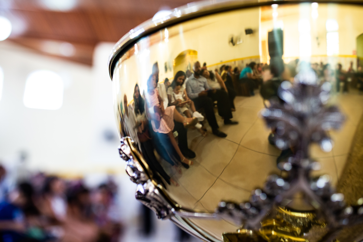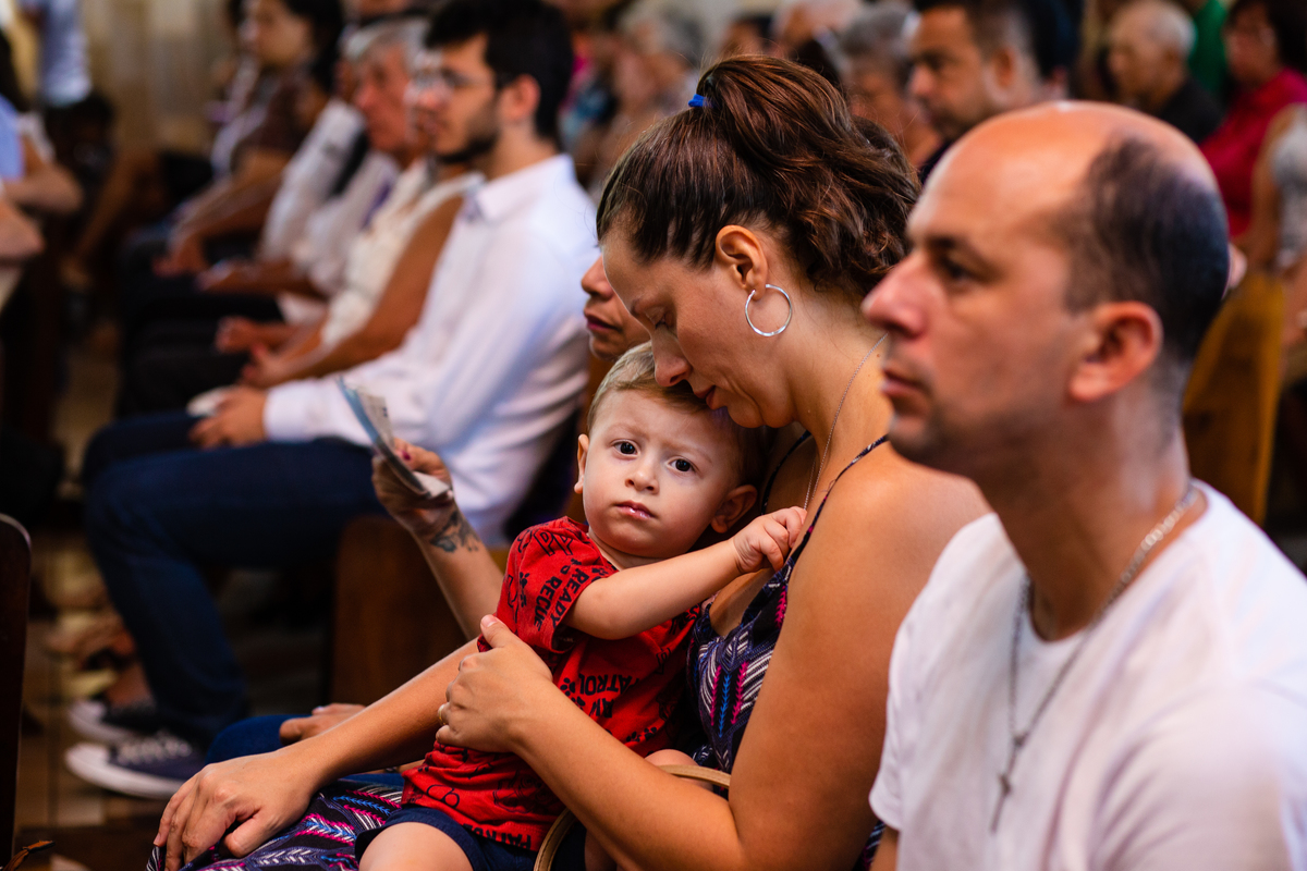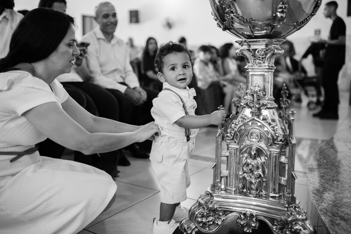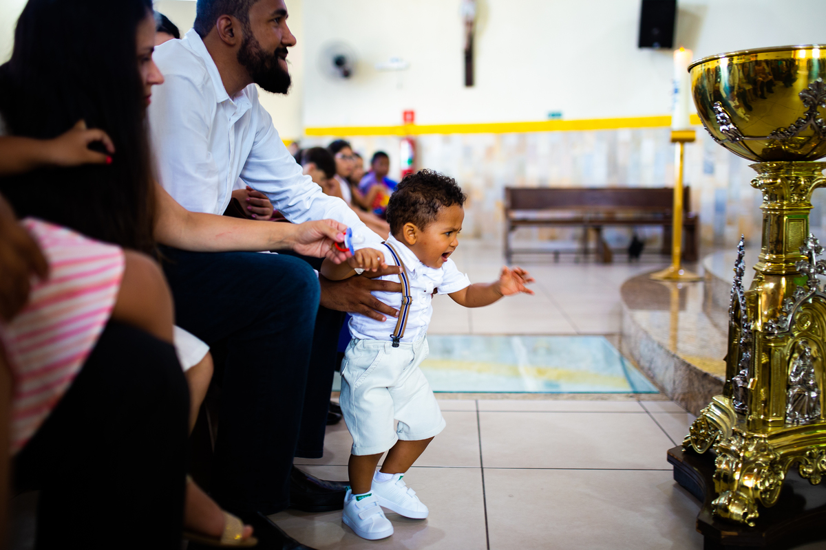 Acompanho muitas famílias e já fotografei muitos momentos especiais. Com a família do Gabriel não foi diferente. Gabriel estava bastante animado e sapeca. Queria andar pela igreja e ver de perto a pia batismal onde receberia um dos sacramentos mais importantes do cristianismo. De tanta energia despendida ele acabou dormindo no meio da cerimônia e acreditem, acordou com a água do batismo molhando sua cabeça!!