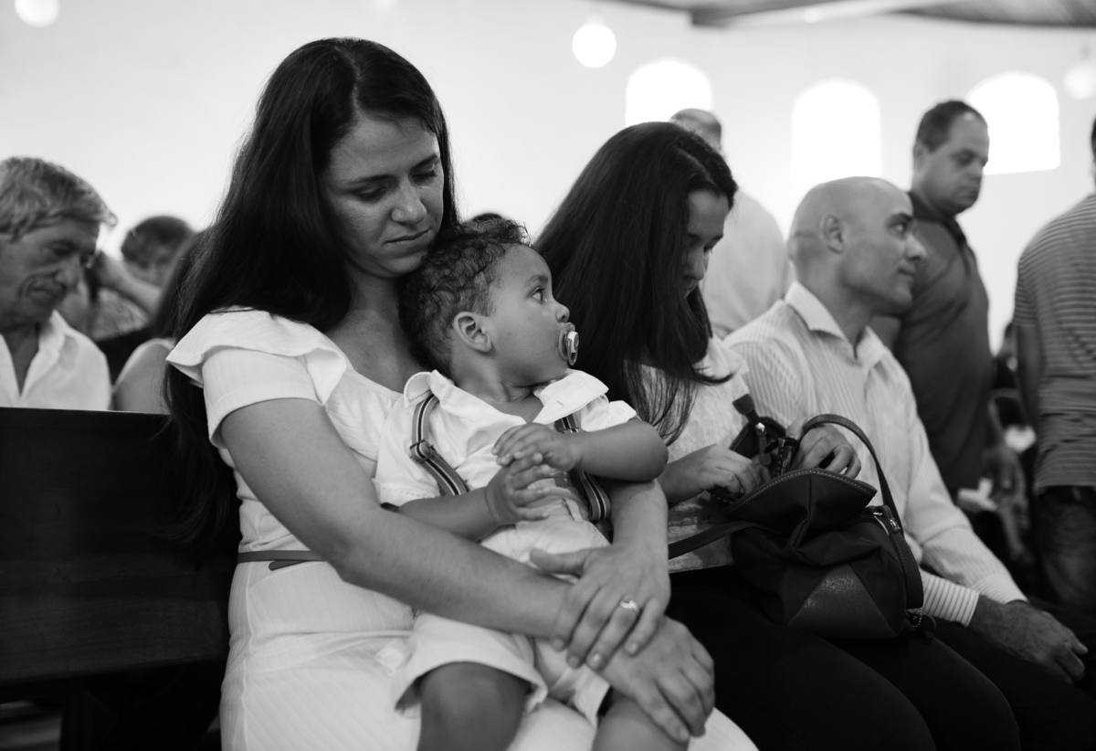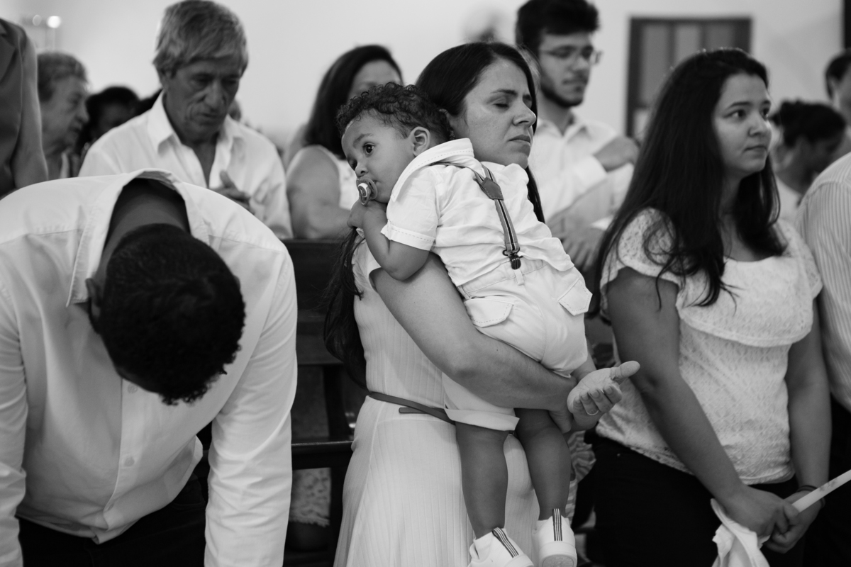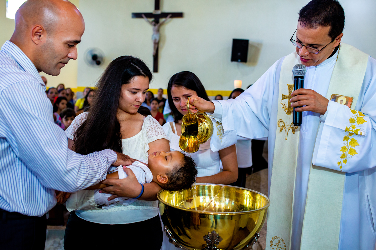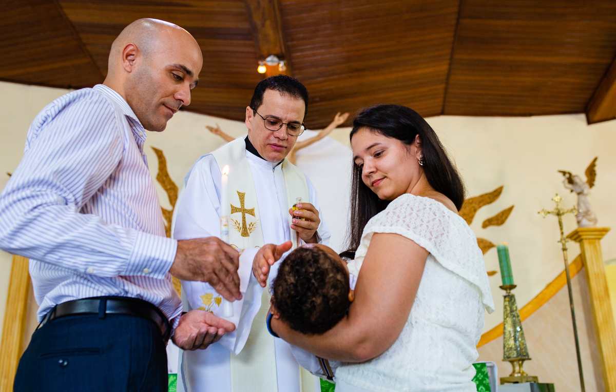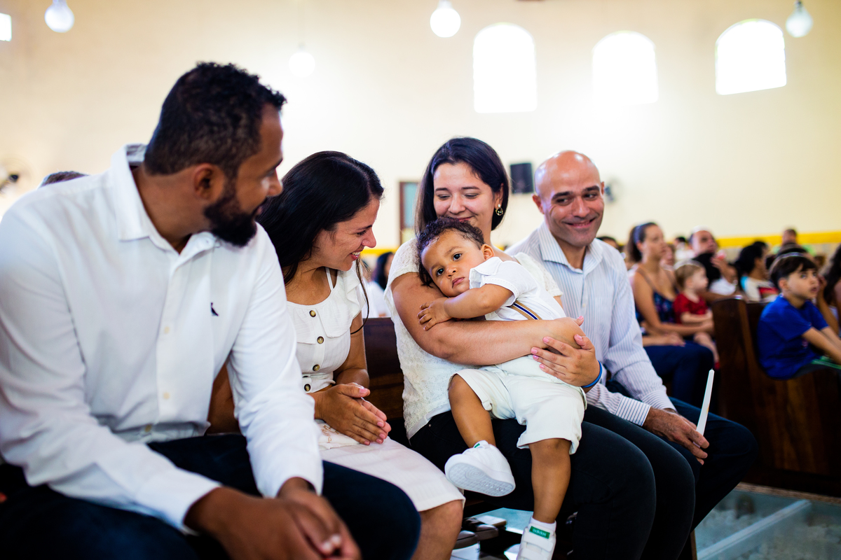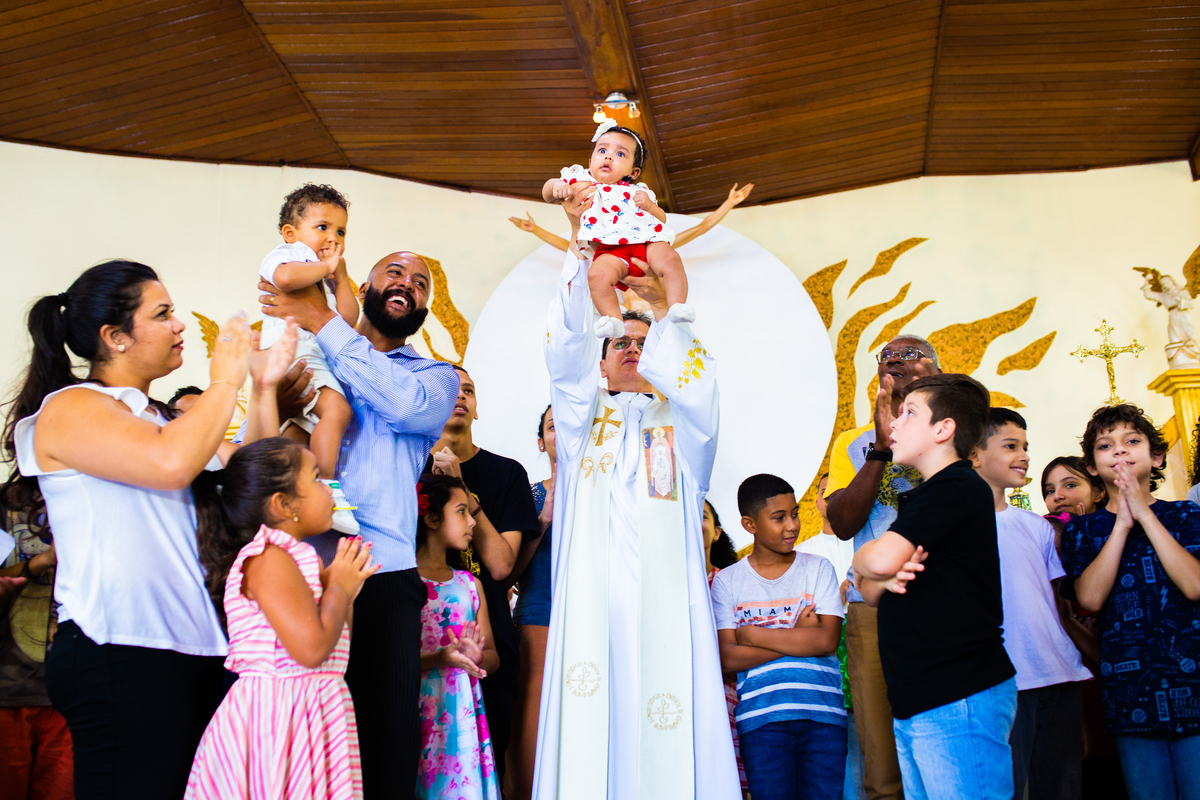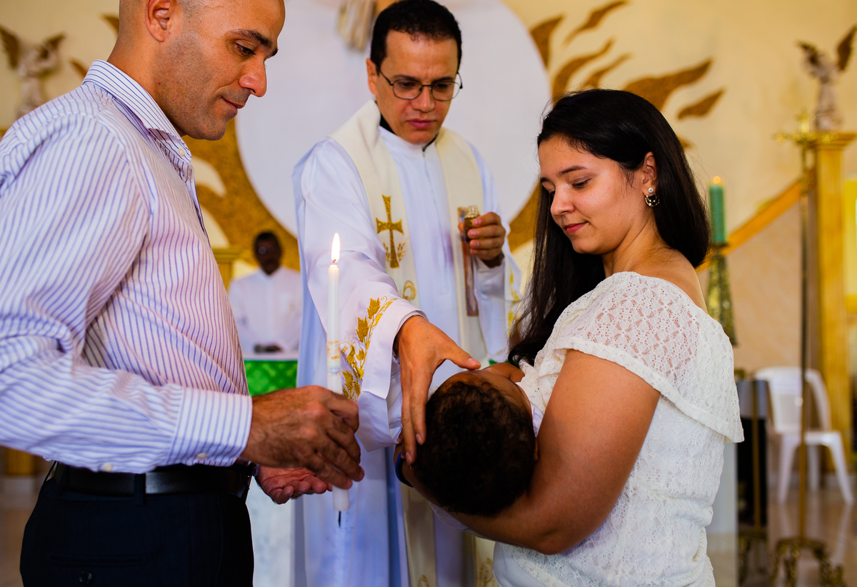 Acompanho muitas famílias e já fotografei muitos momentos especiais. Com a família do Gabriel não foi diferente. Gabriel estava bastante animado e sapeca. Queria andar pela igreja e ver de perto a pia batismal onde receberia um dos sacramentos mais importantes do cristianismo. De tanta energia despendida ele acabou dormindo no meio da cerimônia e acreditem, acordou com a água do batismo molhando sua cabeça!!