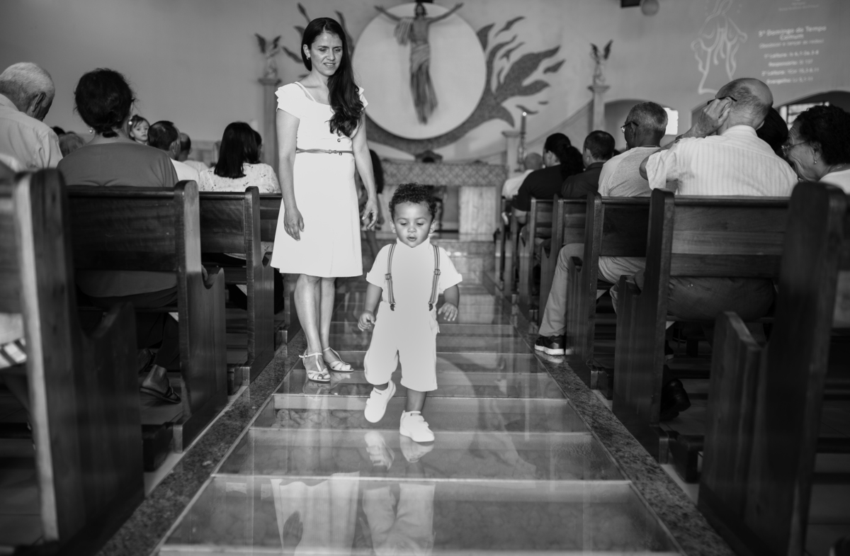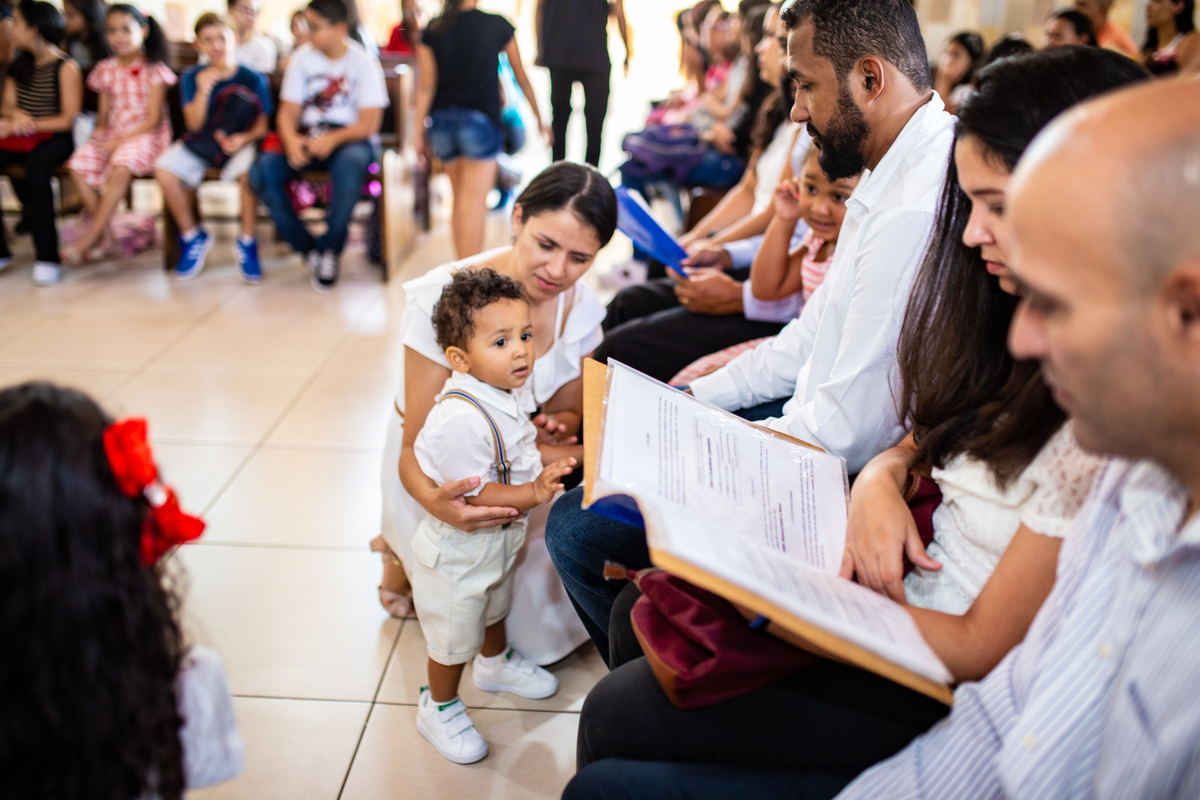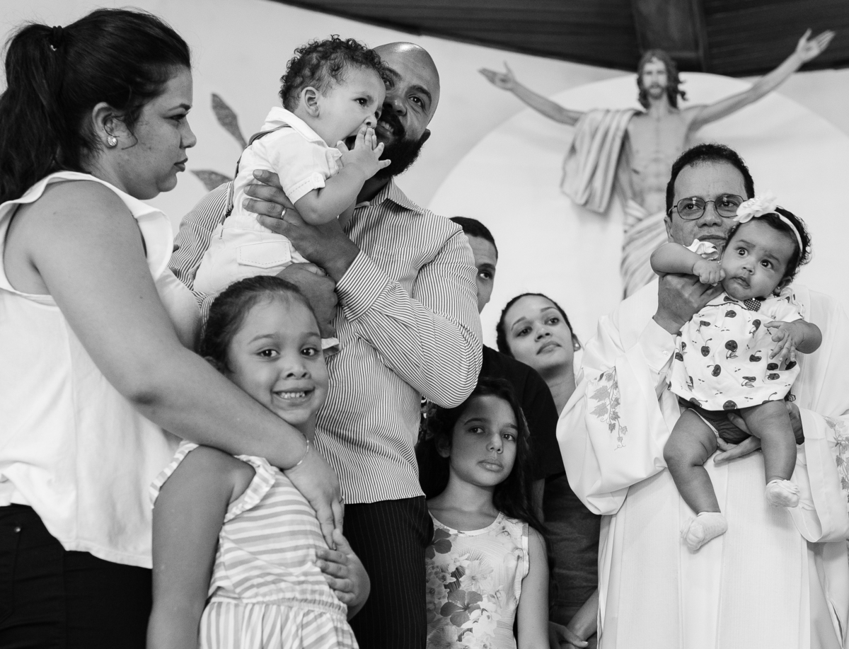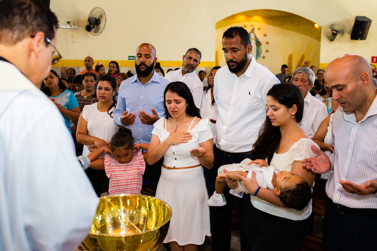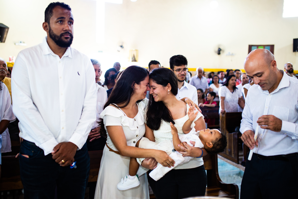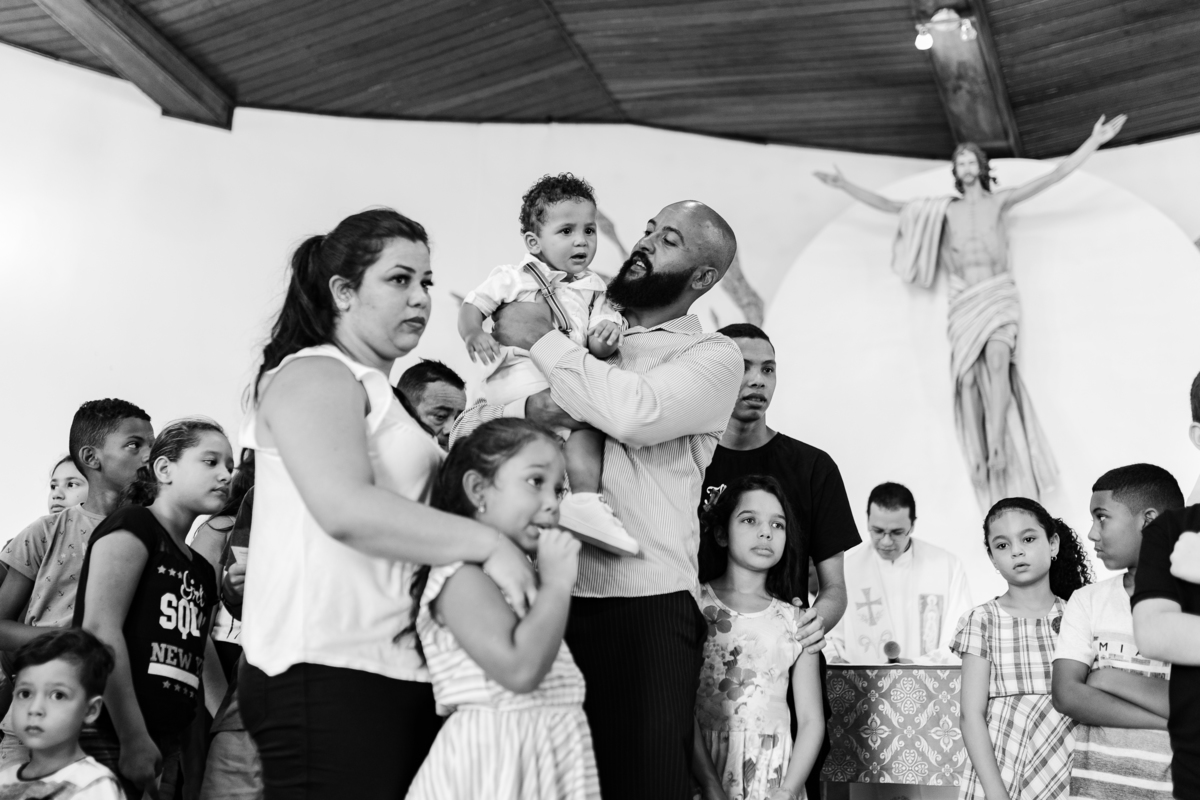 Acompanho muitas famílias e já fotografei muitos momentos especiais. Com a família do Gabriel não foi diferente. Gabriel estava bastante animado e sapeca. Queria andar pela igreja e ver de perto a pia batismal onde receberia um dos sacramentos mais importantes do cristianismo. De tanta energia despendida ele acabou dormindo no meio da cerimônia e acreditem, acordou com a água do batismo molhando sua cabeça!!