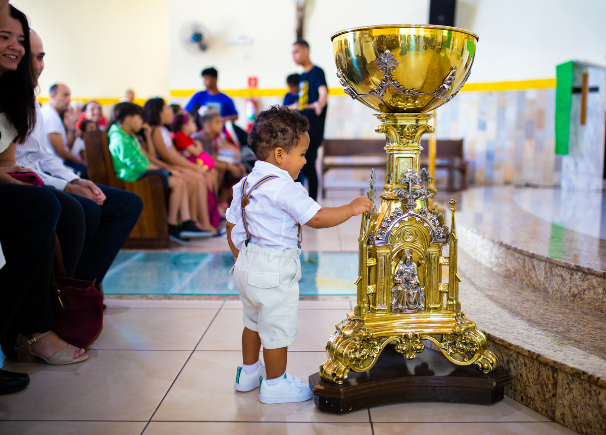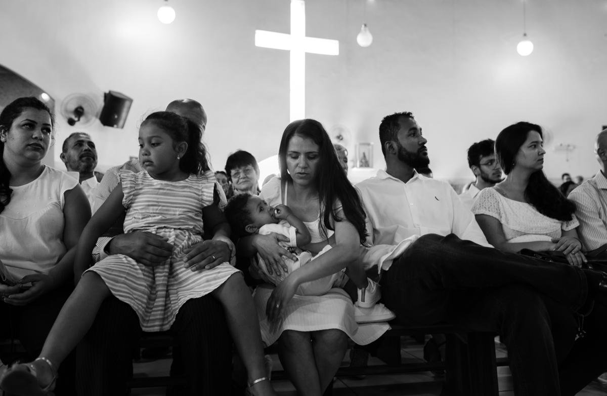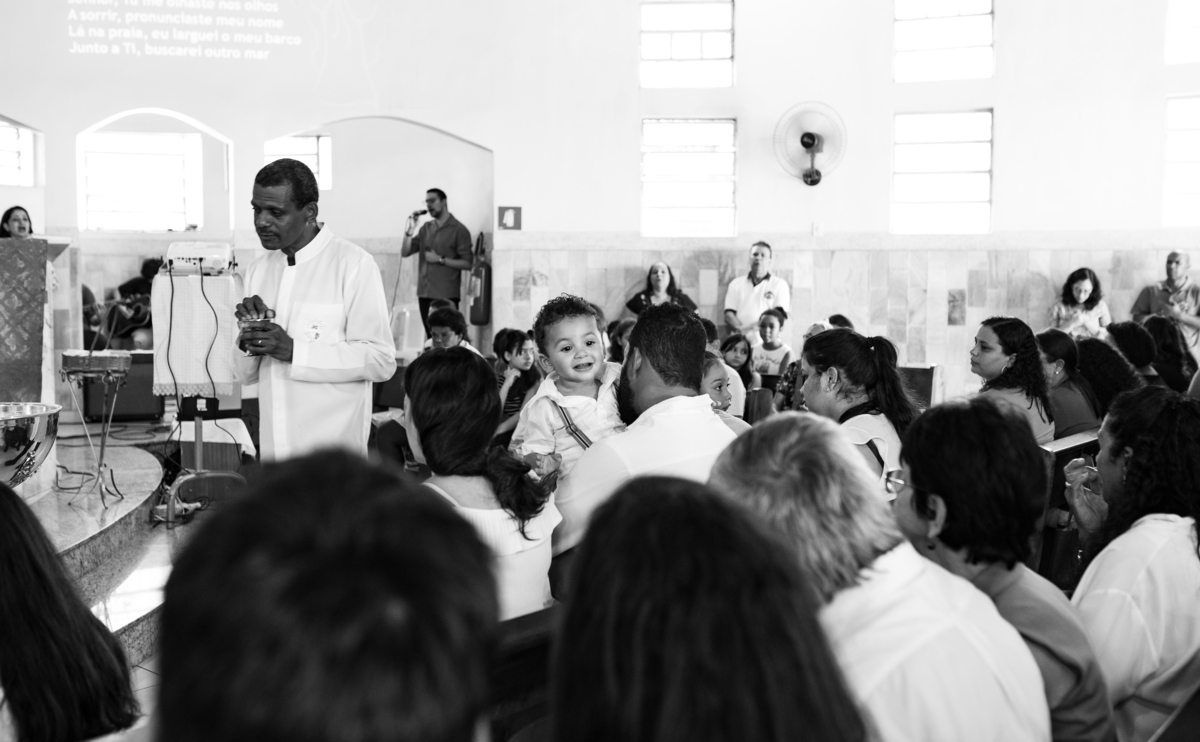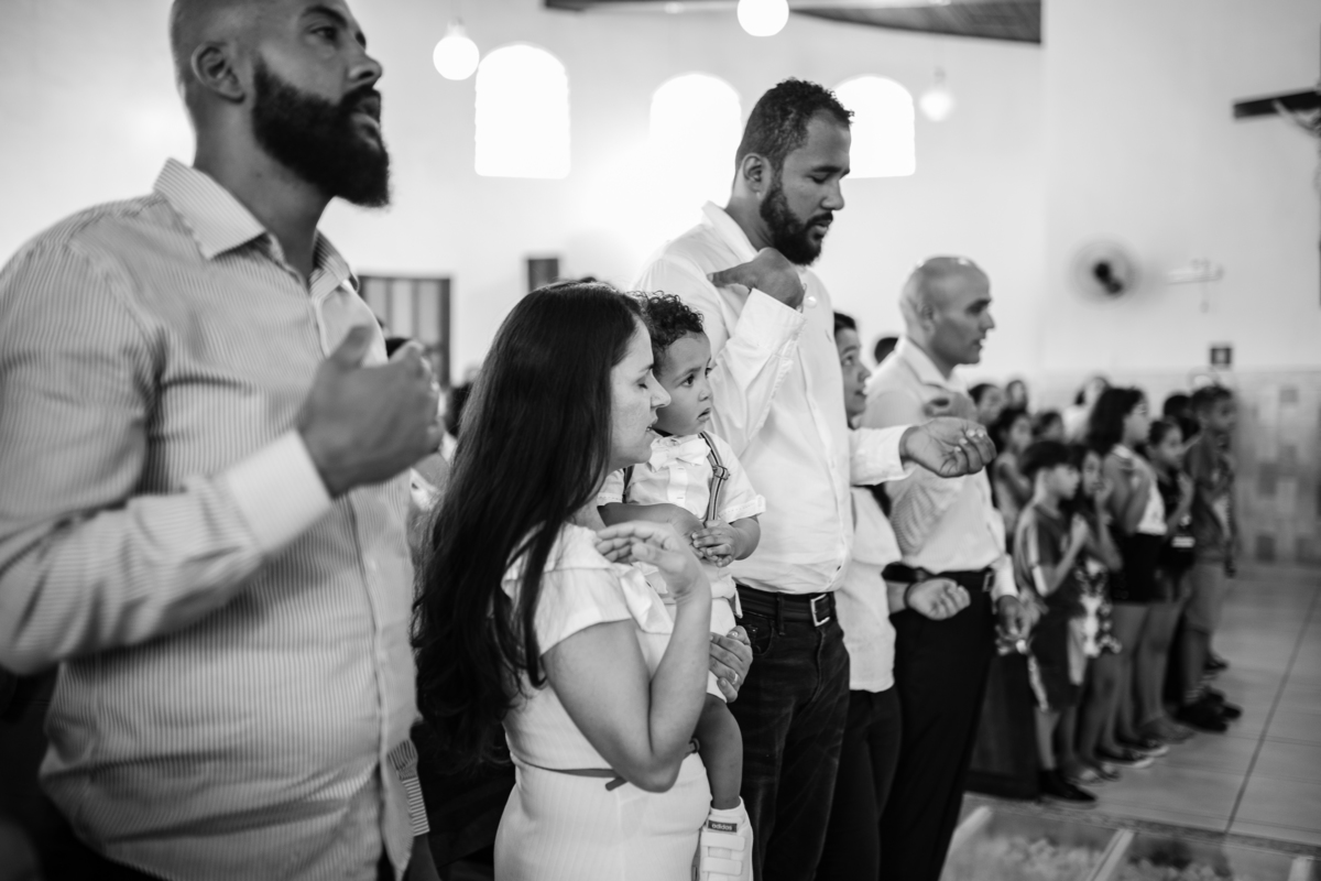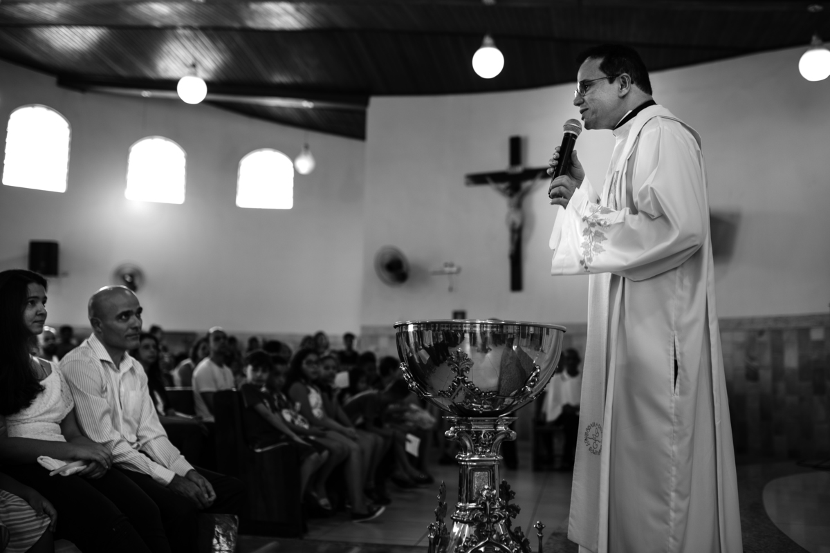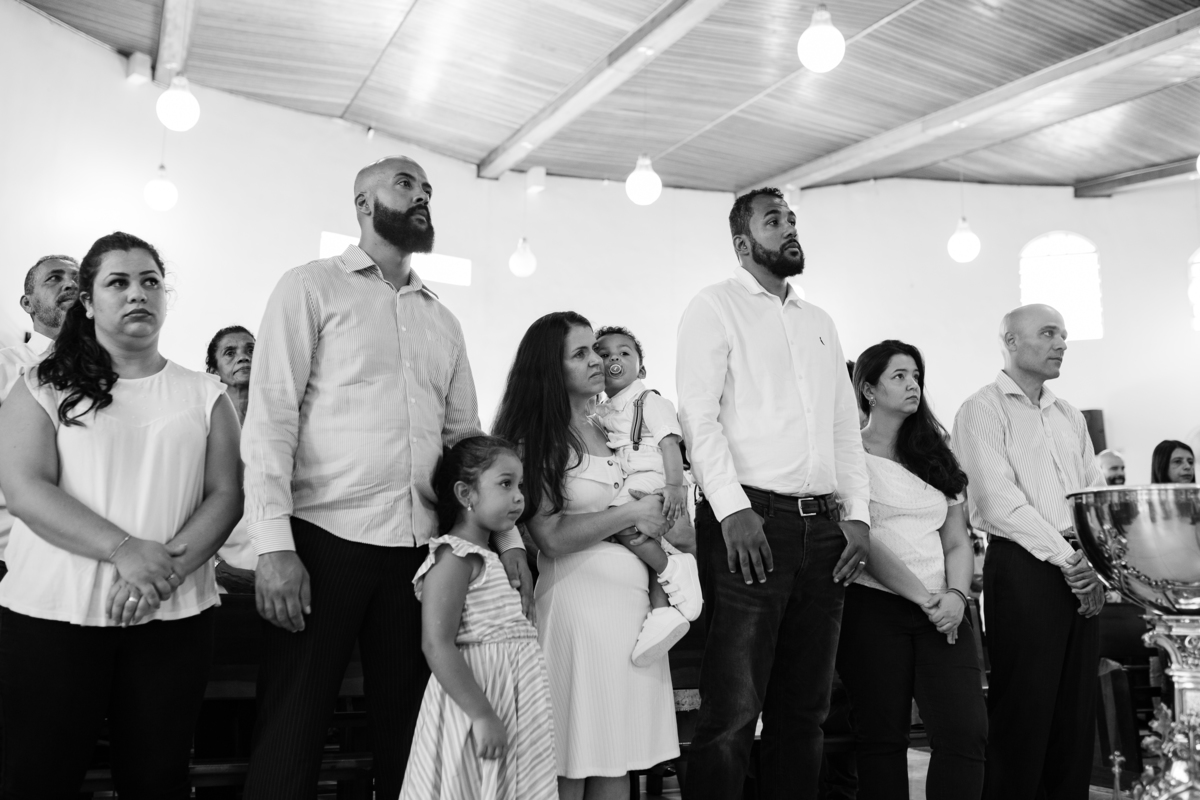 Acompanho muitas famílias e já fotografei muitos momentos especiais. Com a família do Gabriel não foi diferente. Gabriel estava bastante animado e sapeca. Queria andar pela igreja e ver de perto a pia batismal onde receberia um dos sacramentos mais importantes do cristianismo. De tanta energia despendida ele acabou dormindo no meio da cerimônia e acreditem, acordou com a água do batismo molhando sua cabeça!!