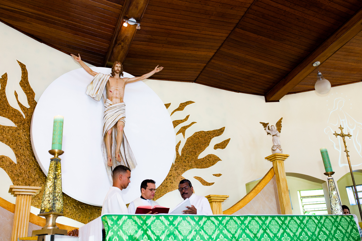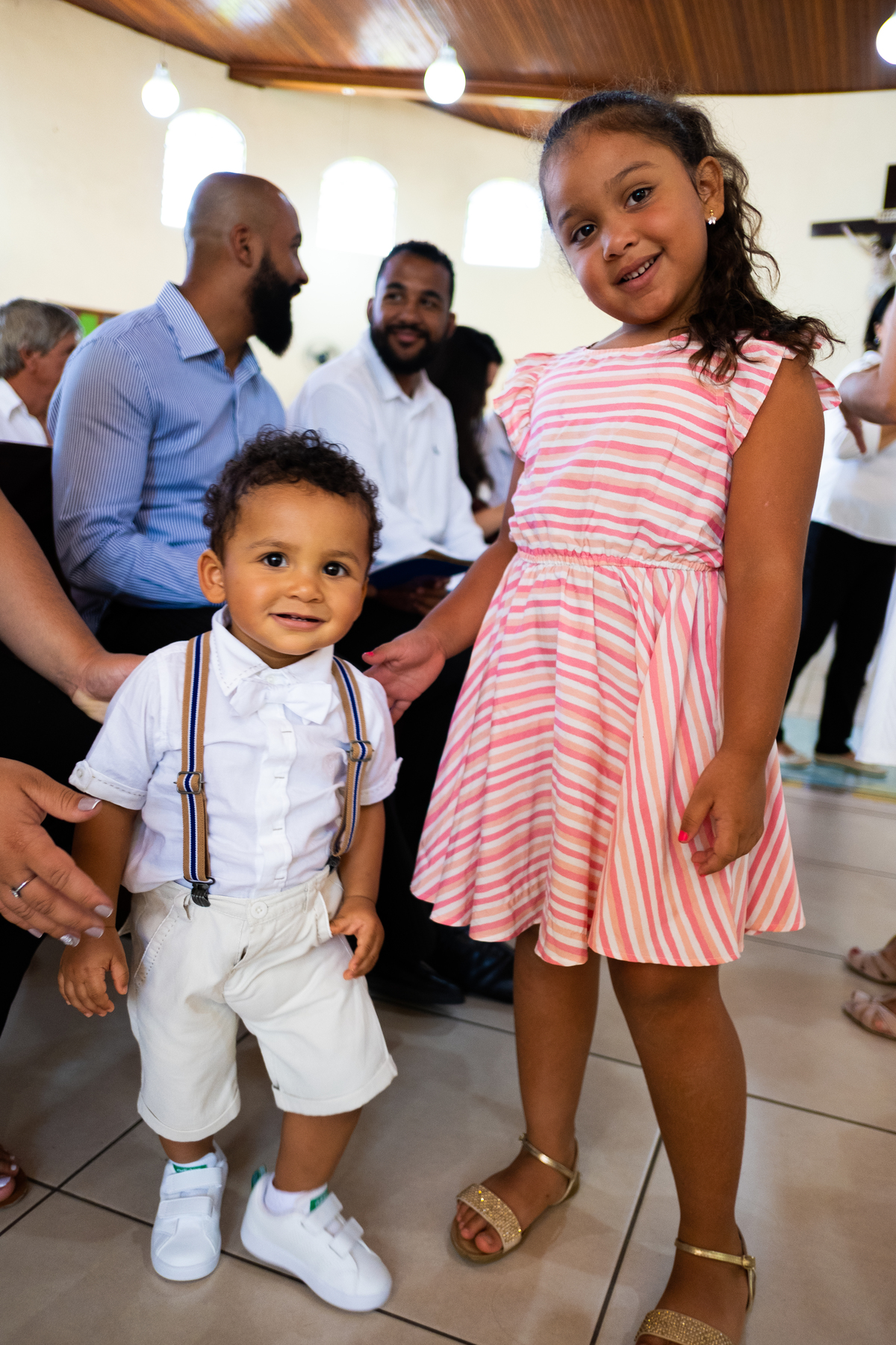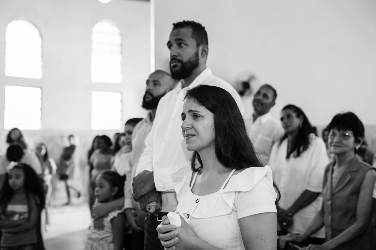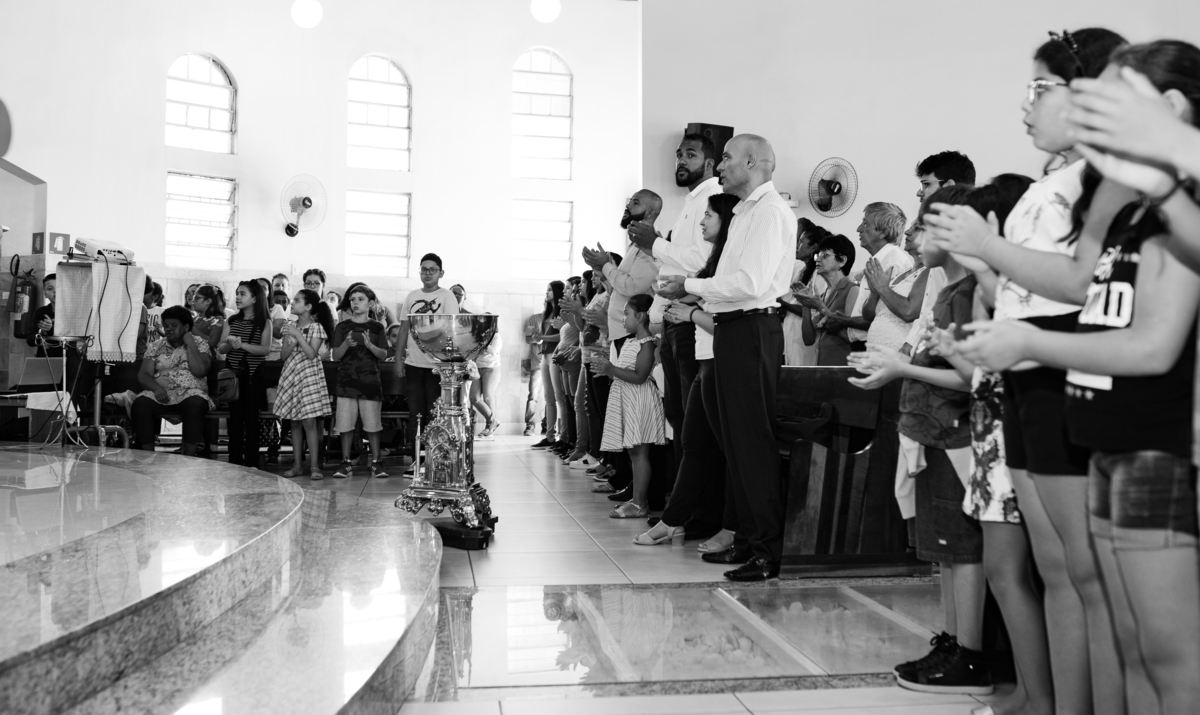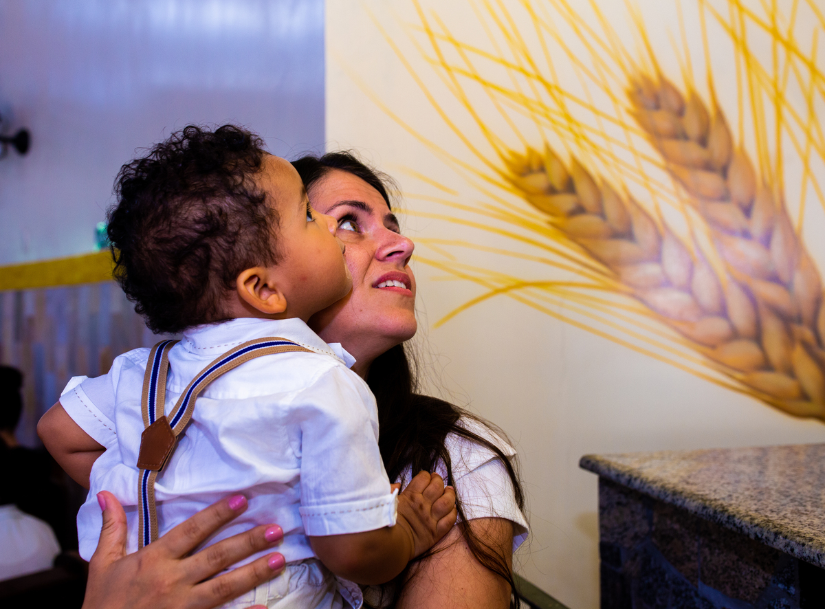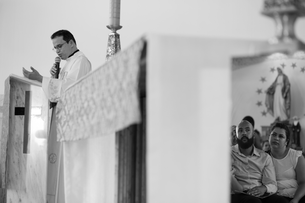 Acompanho muitas famílias e já fotografei muitos momentos especiais. Com a família do Gabriel não foi diferente. Gabriel estava bastante animado e sapeca. Queria andar pela igreja e ver de perto a pia batismal onde receberia um dos sacramentos mais importantes do cristianismo. De tanta energia despendida ele acabou dormindo no meio da cerimônia e acreditem, acordou com a água do batismo molhando sua cabeça!!